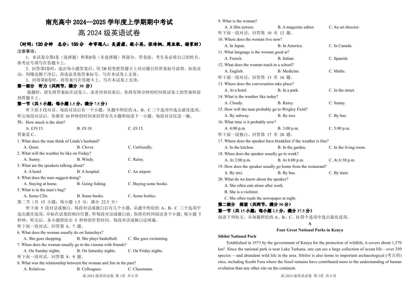 四川省南充高级中学2024-2025学年高一上学期期中考试英语