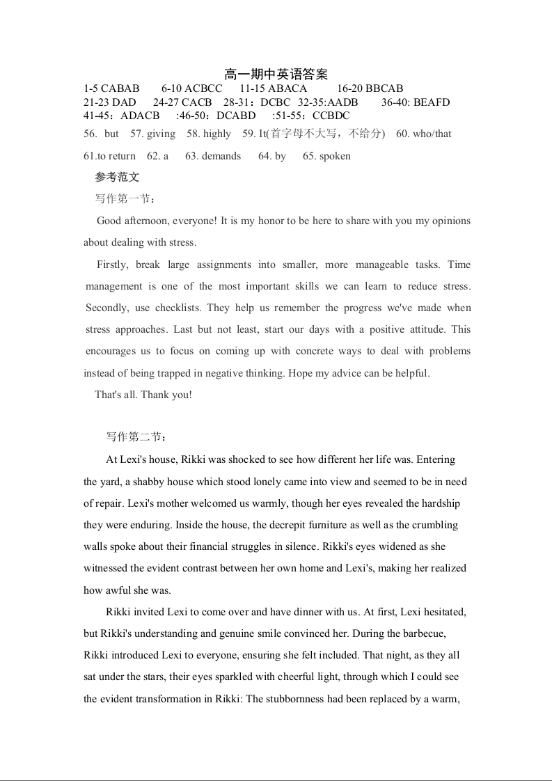 四川省南充高级中学2024-2025学年高一上学期期中考试英语答案