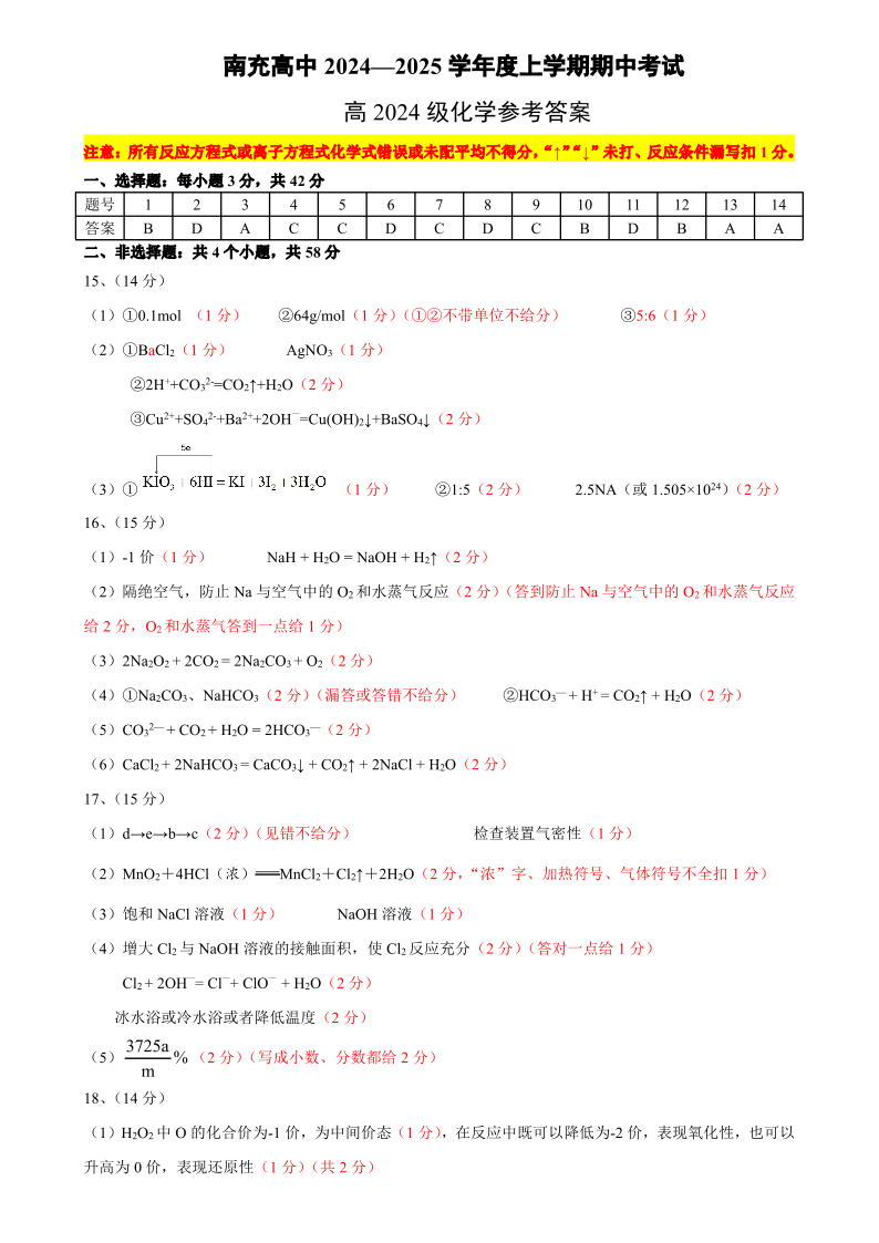 四川省南充高级中学2024-2025学年高一上学期期中考试化学答案