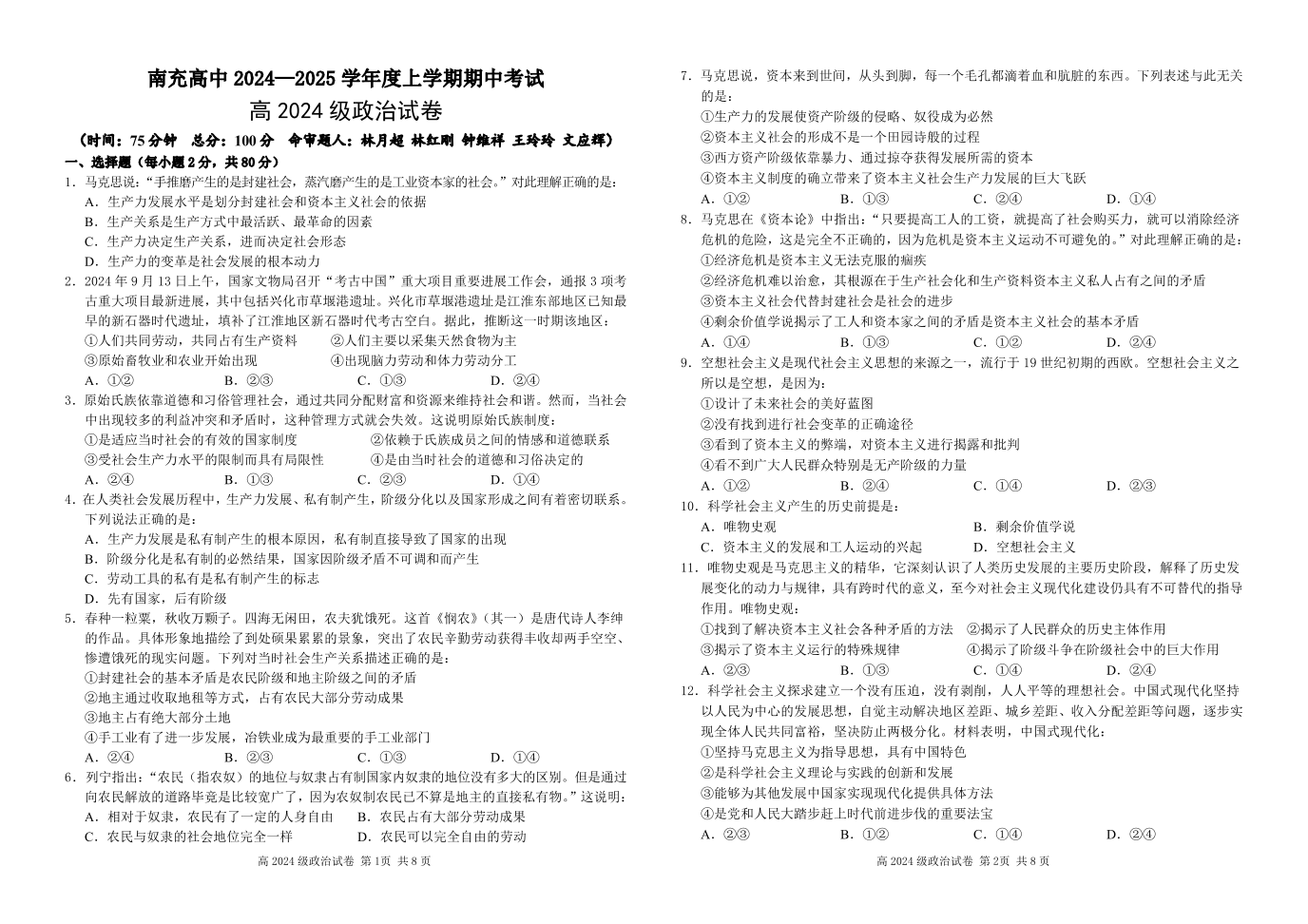 四川省南充高级中学2024-2025学年高一上学期期中考试政治