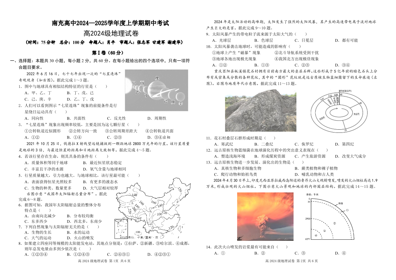 四川省南充高级中学2024-2025学年高一上学期期中考试地理