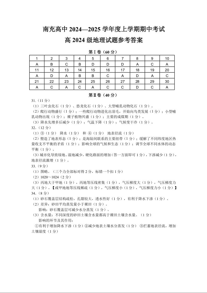 四川省南充高级中学2024-2025学年高一上学期期中考试地理答案