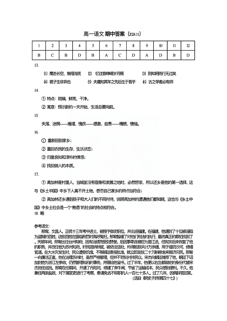 天津市红桥区2024-2025学年高一上学期期中考试语文答案