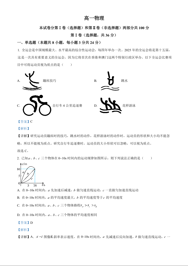 天津市红桥区2024-2025学年高一上学期期中考试物理(解析版)
