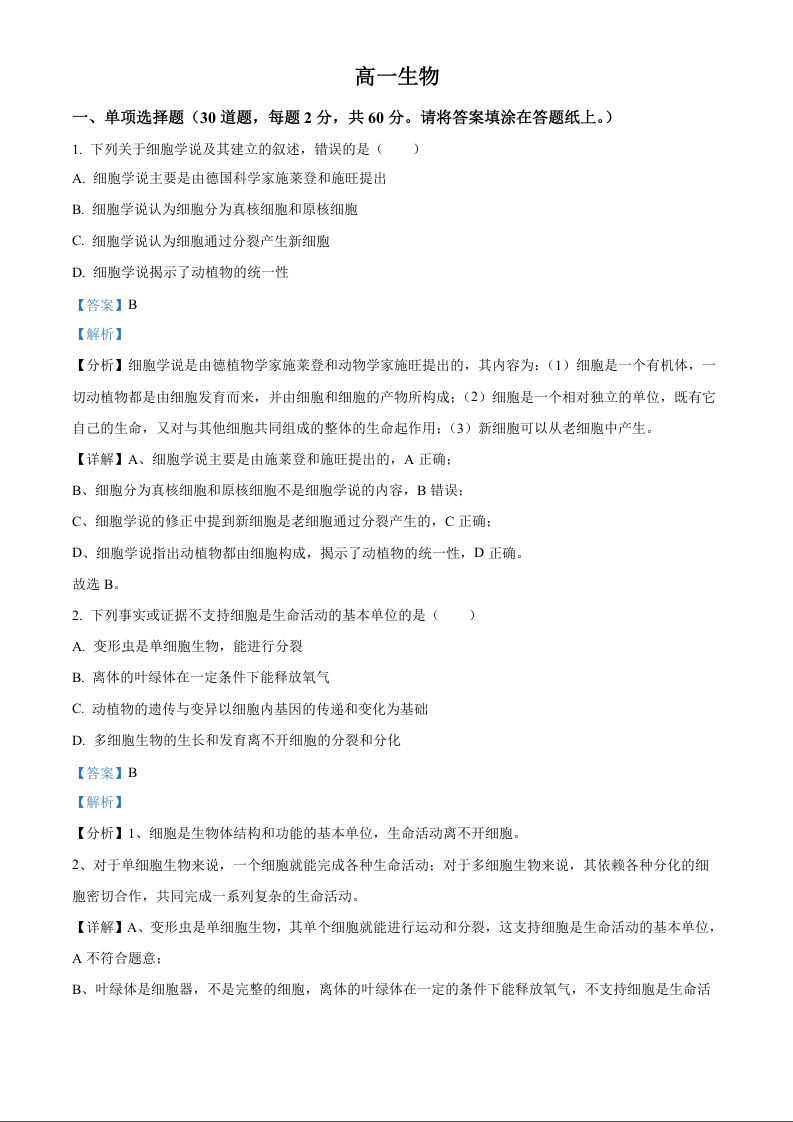 天津市红桥区2024-2025学年高一上学期期中考试生物(解析版)