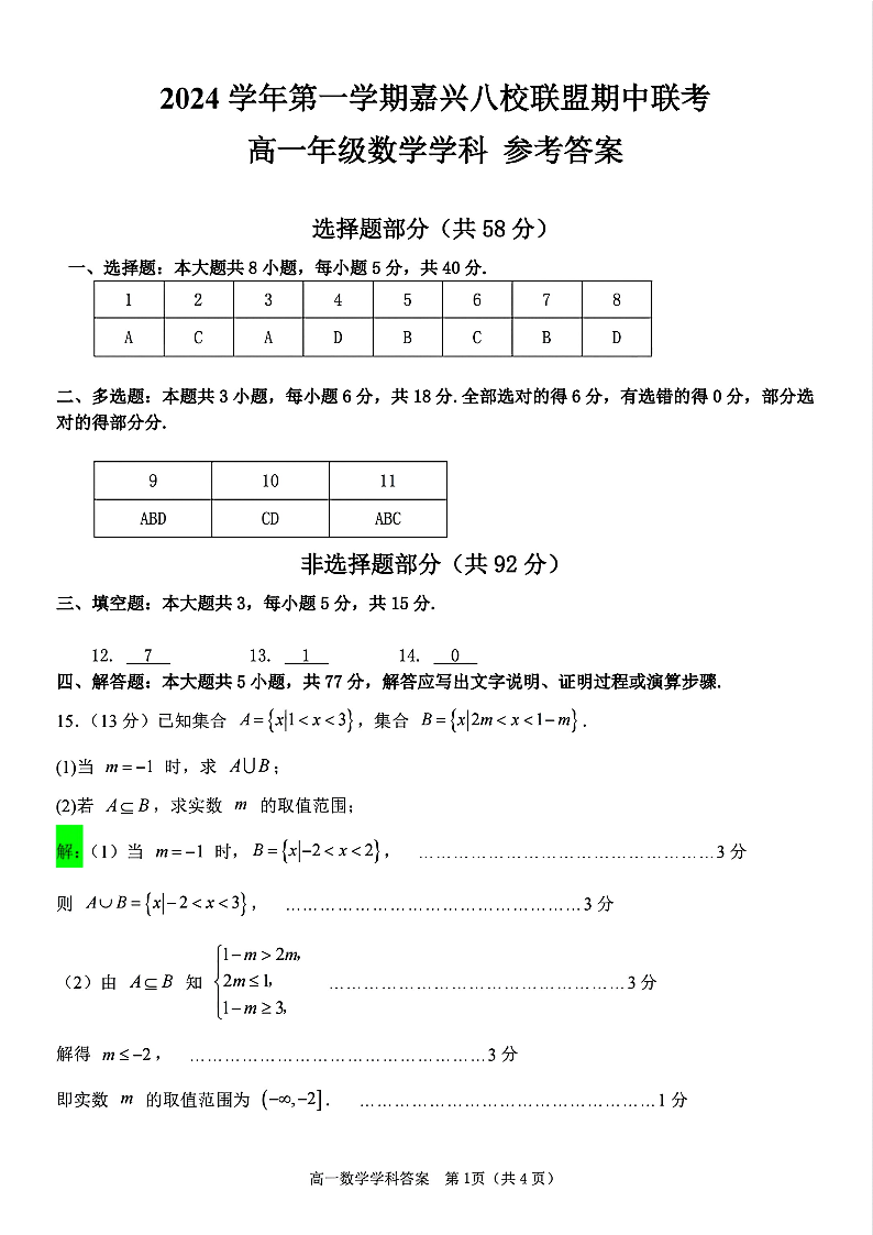浙江嘉兴八校联盟2024学年第一学期期中联考数学答案