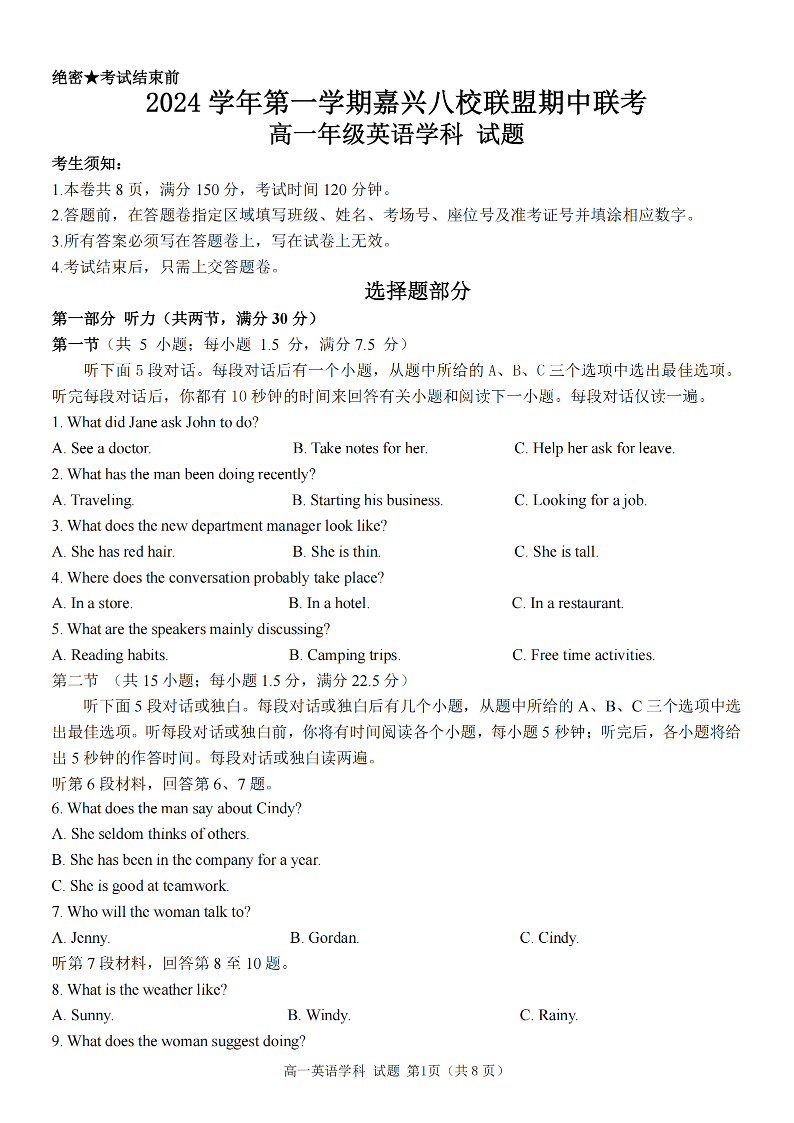 浙江嘉兴八校联盟2024学年第一学期期中联考英语