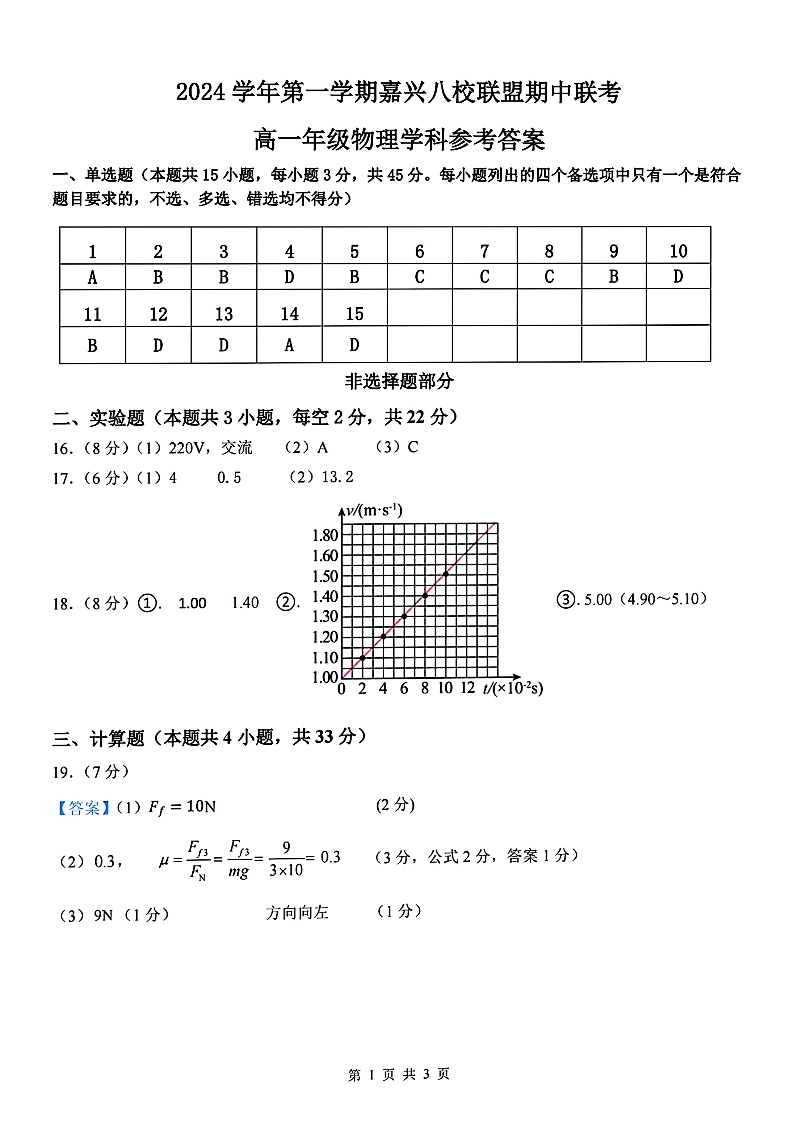 浙江嘉兴八校联盟2024学年第一学期期中联考物理答案