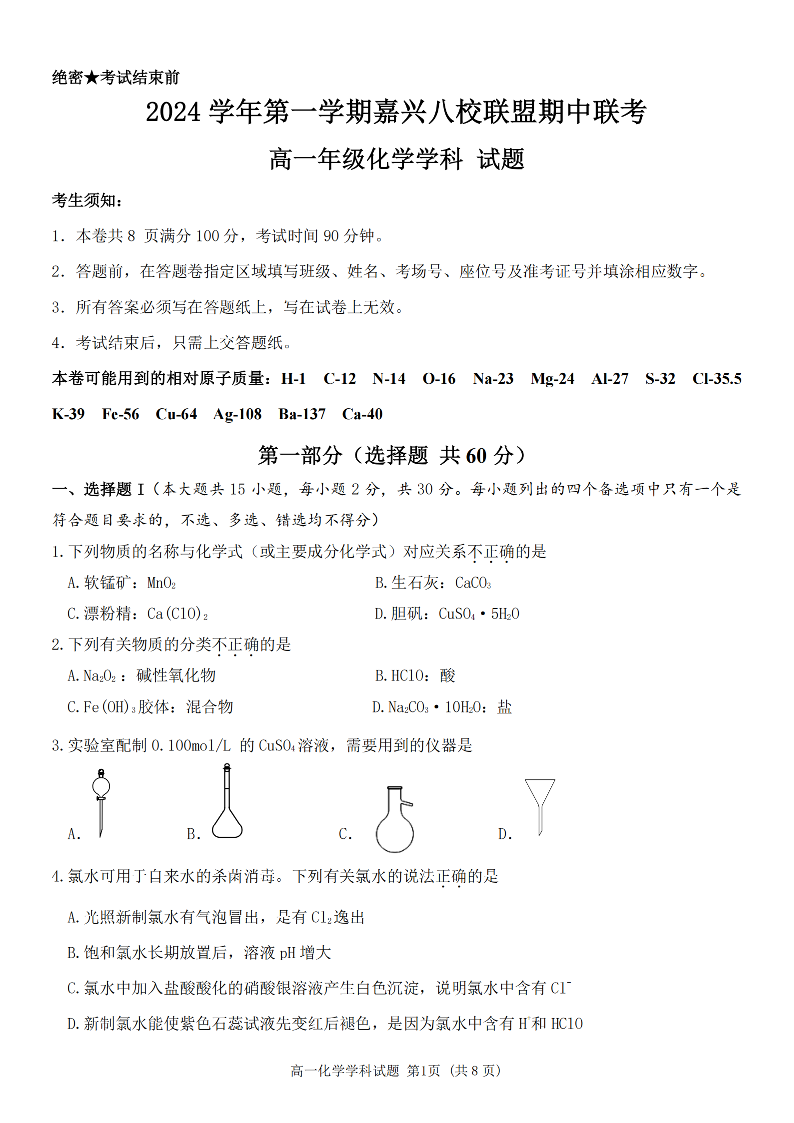浙江嘉兴八校联盟2024学年第一学期期中联考化学