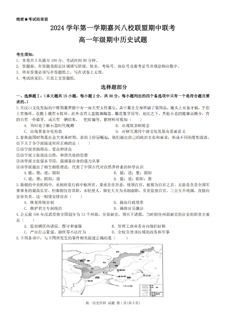 浙江嘉兴八校联盟2024学年第一学期期中联考历史
