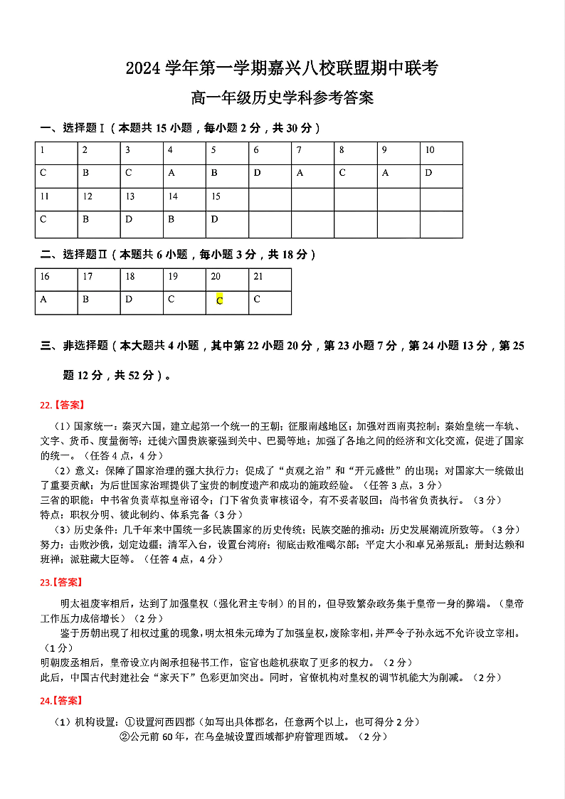浙江嘉兴八校联盟2024学年第一学期期中联考历史答案