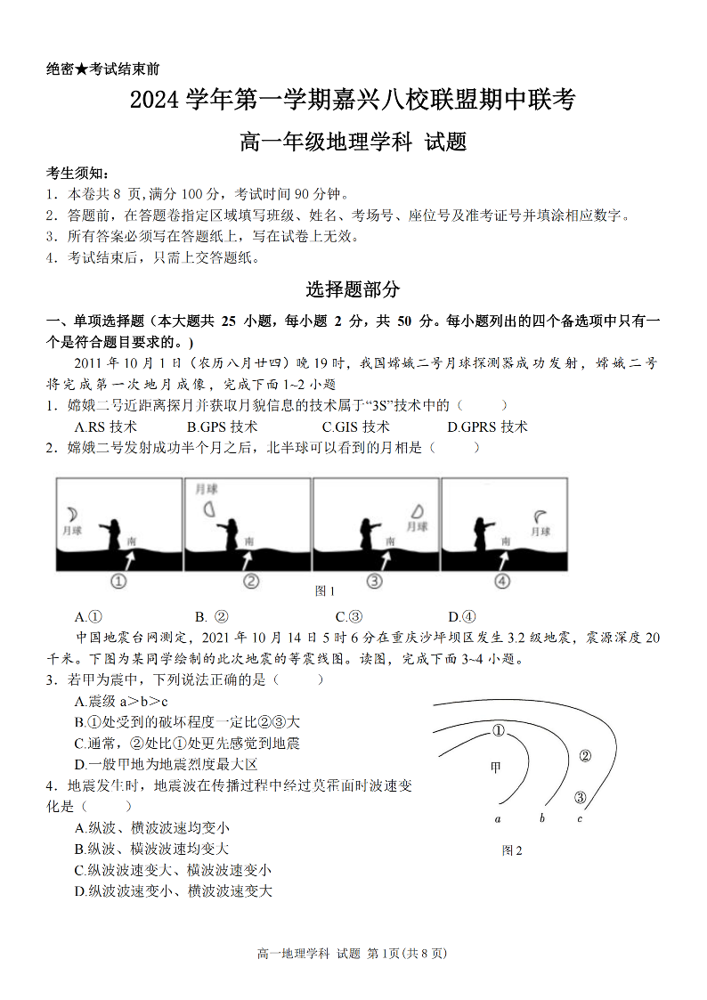 浙江嘉兴八校联盟2024学年第一学期期中联考地理