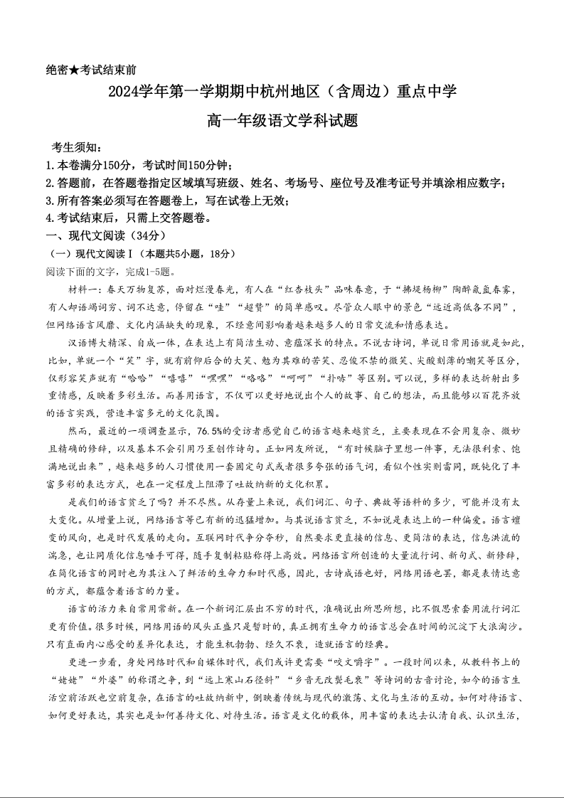 浙江省杭州地区(含周边)重点中学2024-2025学年高一上学期11月期中语文