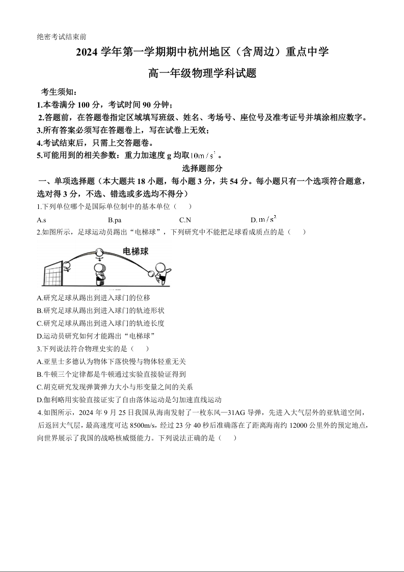 浙江省杭州地区(含周边)重点中学2024-2025学年高一上学期11月期中物理+答案