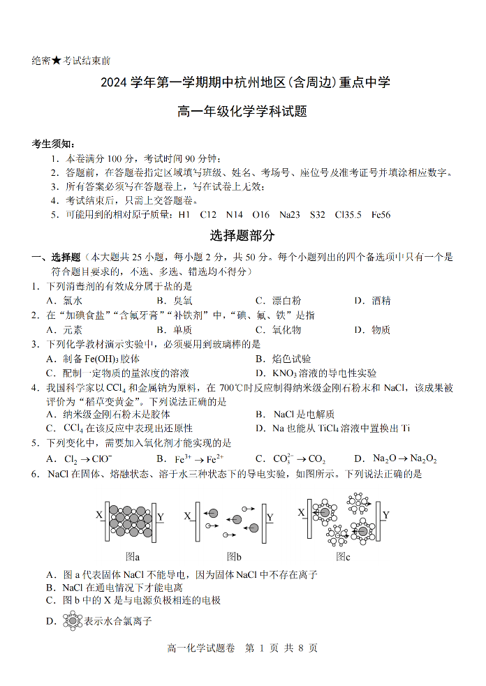 浙江省杭州地区(含周边)重点中学2024-2025学年高一上学期11月期中化学+答案