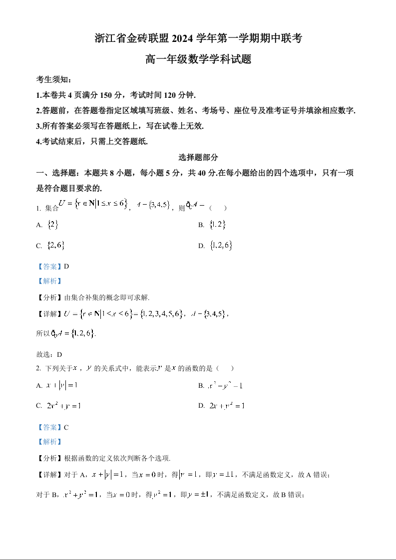 浙江省金砖联盟2024-2025学年高一上学期期中联考数学(精品解析版)