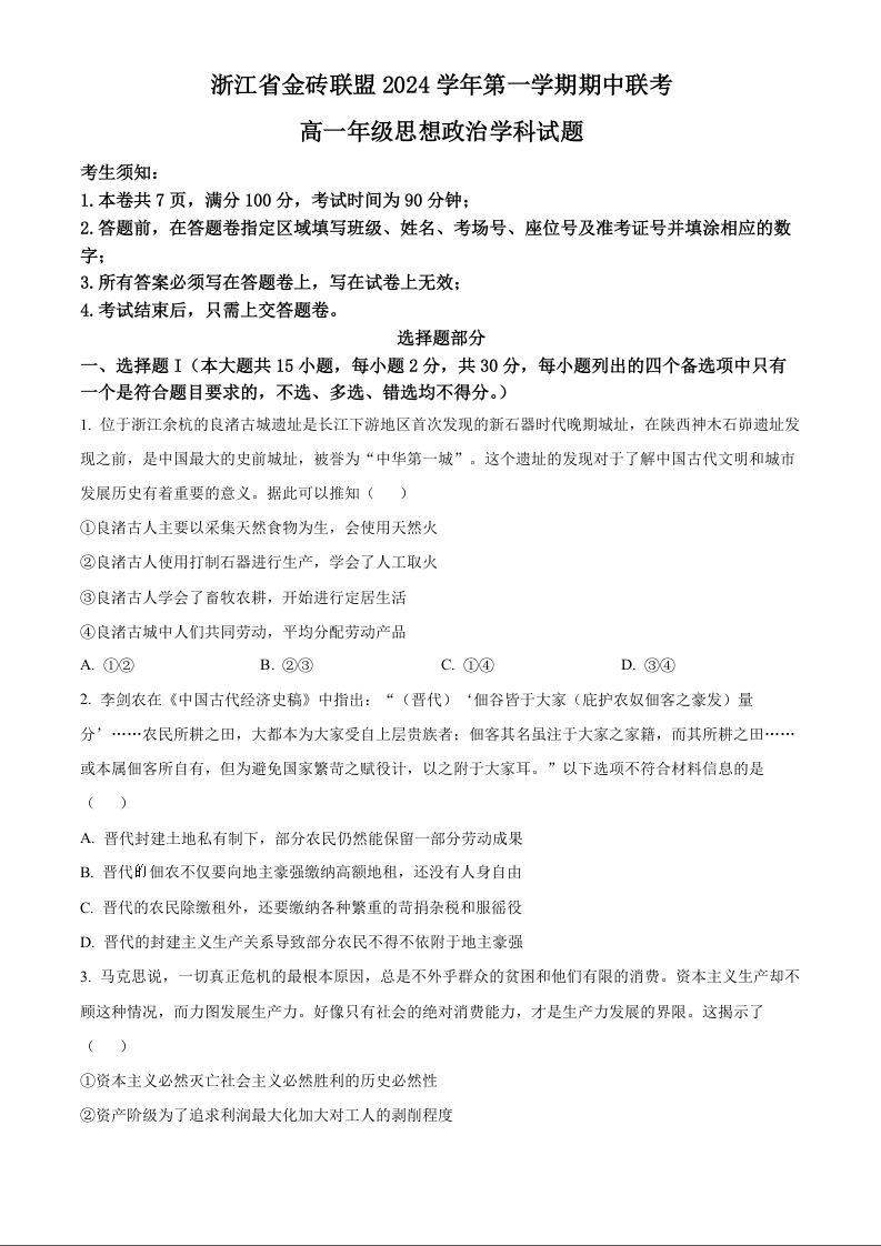 浙江省金砖联盟2024-2025学年高一上学期期中联考政治(原卷版)