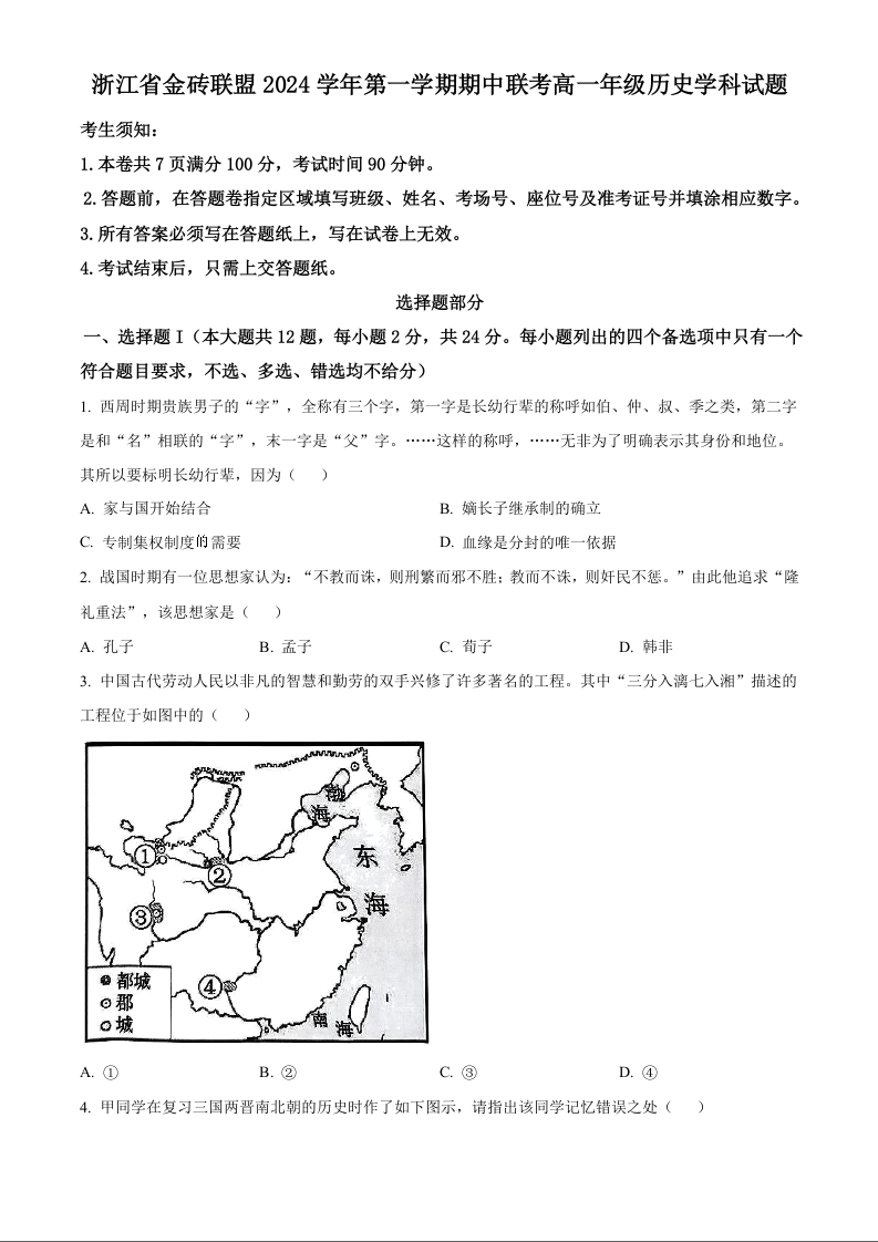 浙江省金砖联盟2024-2025学年高一上学期期中联考历史(原卷版)