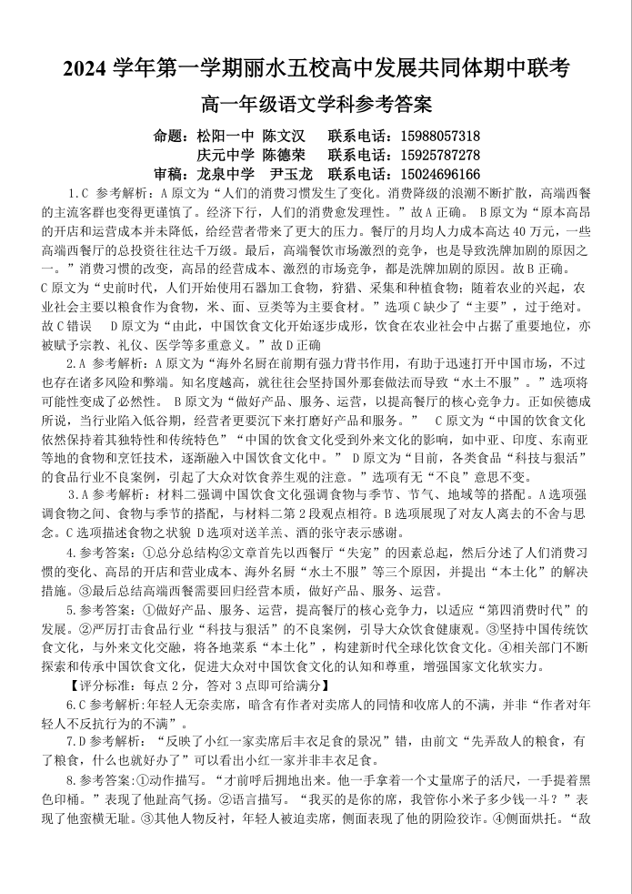 浙江省丽水市五校高中发展共同体2024-2025学年高一上学期11月期中联考语文答案