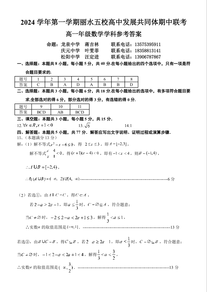 浙江省丽水市五校高中发展共同体2024-2025学年高一上学期11月期中联考数学答案