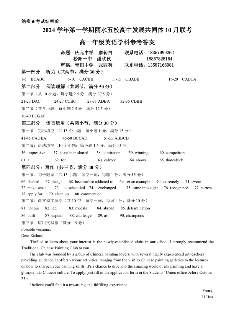 浙江省丽水市五校高中发展共同体2024-2025学年高一上学期11月期中联考英语答案