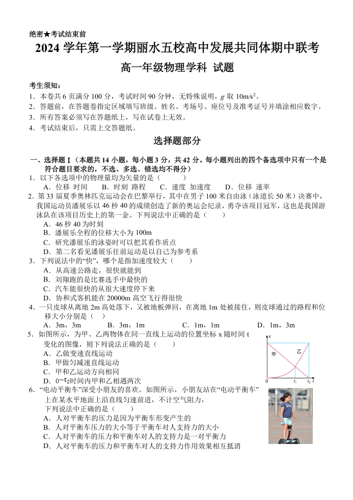 浙江省丽水市五校高中发展共同体2024-2025学年高一上学期11月期中联考物理