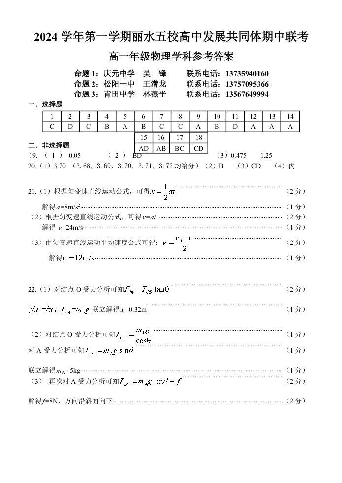 浙江省丽水市五校高中发展共同体2024-2025学年高一上学期11月期中联考物理答案
