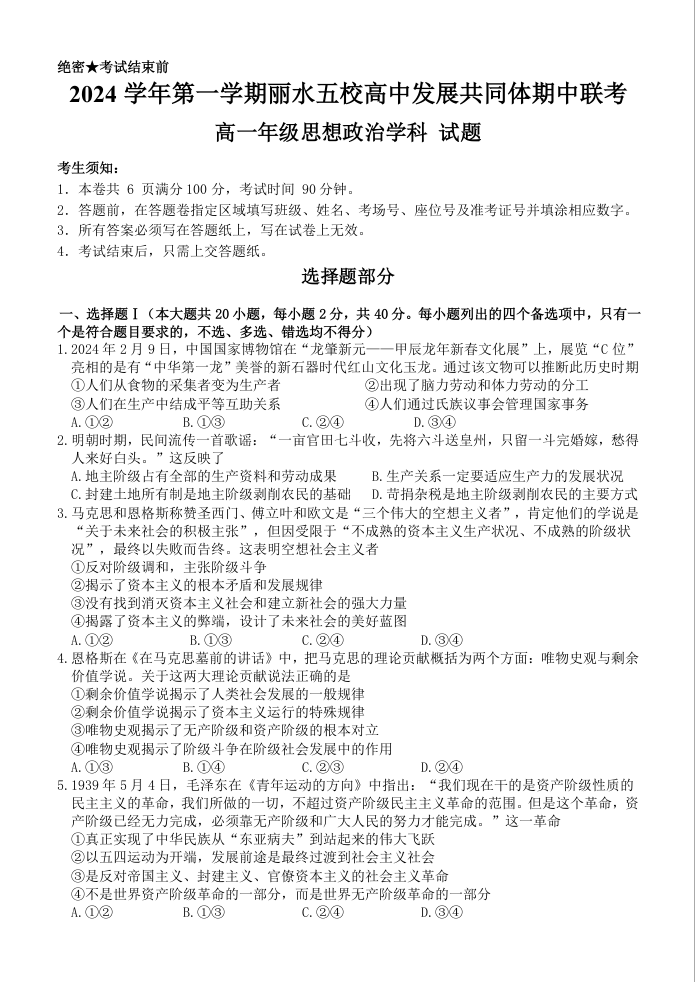 浙江省丽水市五校高中发展共同体2024-2025学年高一上学期11月期中联考政治