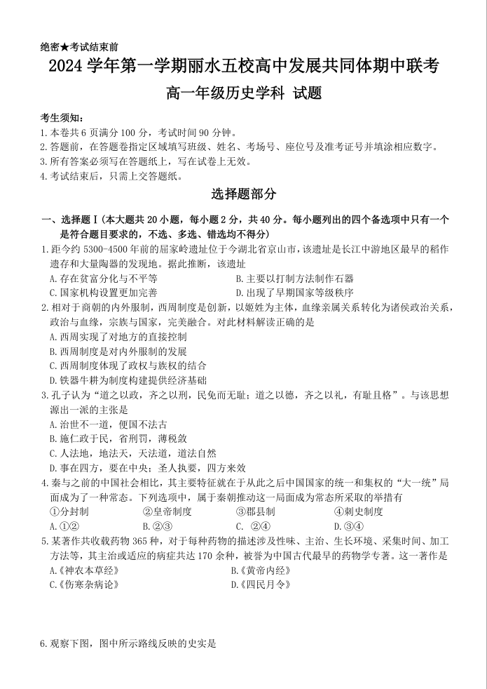 浙江省丽水市五校高中发展共同体2024-2025学年高一上学期11月期中联考历史