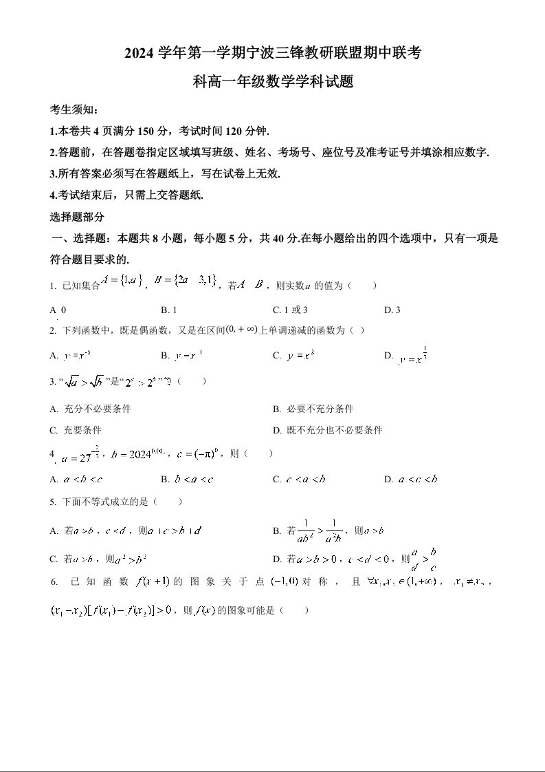 浙江省宁波市三锋联盟2024-2025学年高一上学期11月期中考试数学+解析