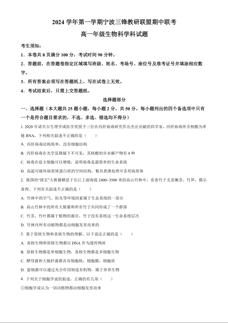 浙江省宁波市三锋联盟2024-2025学年高一上学期11月期中考试生物+解析