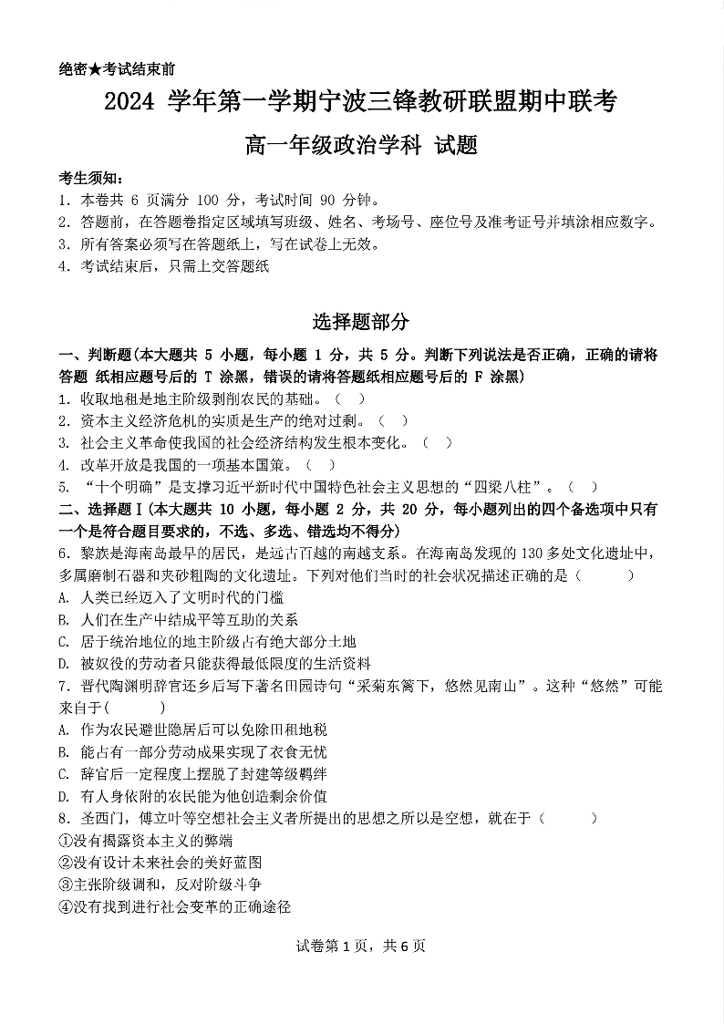 浙江省宁波市三锋联盟2024-2025学年高一上学期11月期中考试政治+答案
