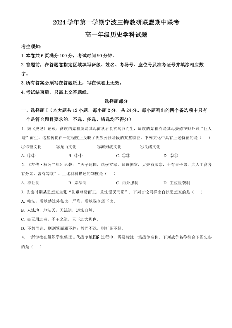 浙江省宁波市三锋联盟2024-2025学年高一上学期11月期中考试历史+解析