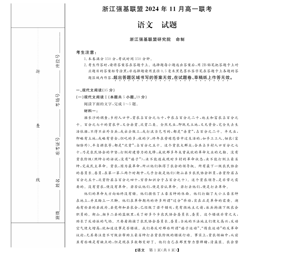 浙江省强基联盟2024-2025学年高一上学期11月联考语文