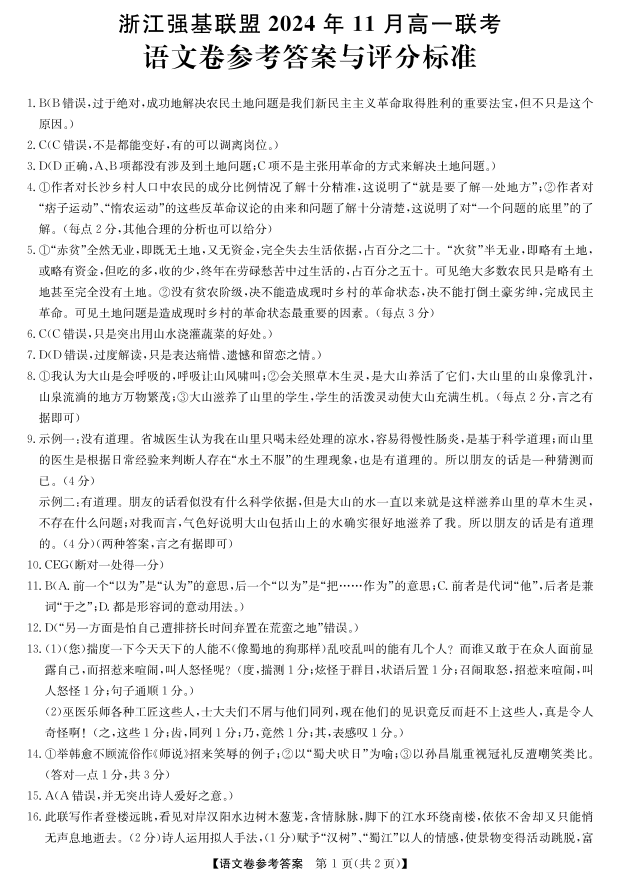 浙江省强基联盟2024-2025学年高一上学期11月联考语文答案