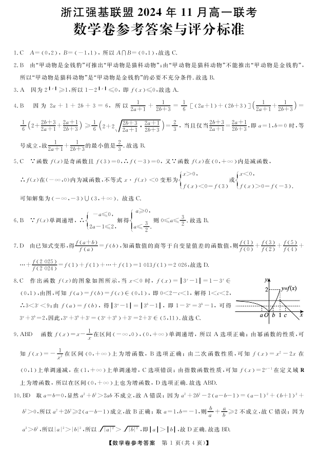 浙江省强基联盟2024-2025学年高一上学期11月联考数学答案