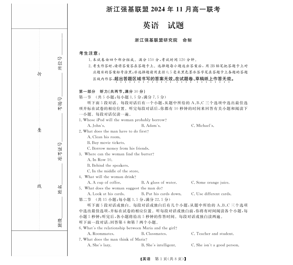 浙江省强基联盟2024-2025学年高一上学期11月联考英语