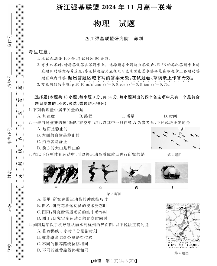浙江省强基联盟2024-2025学年高一上学期11月联考物理