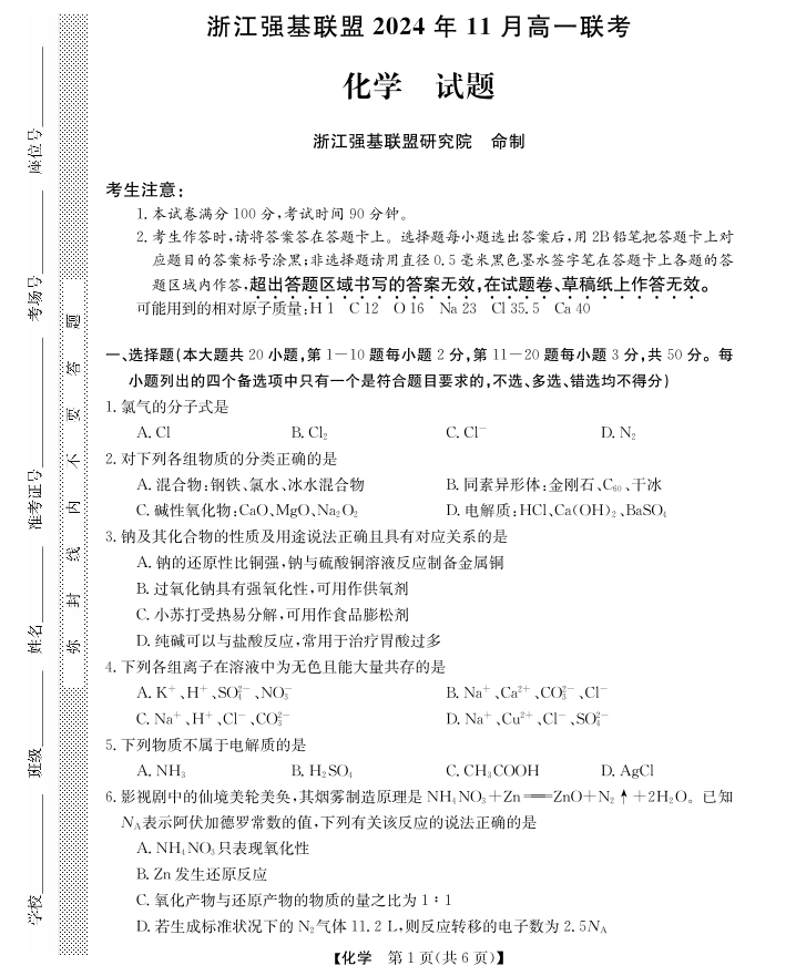 浙江省强基联盟2024-2025学年高一上学期11月联考化学