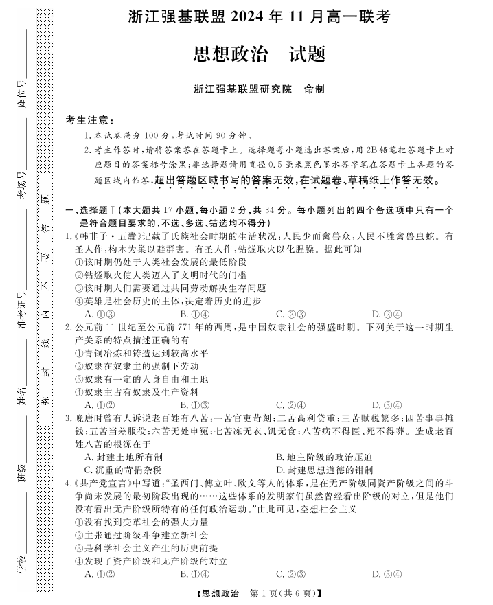 浙江省强基联盟2024-2025学年高一上学期11月联考政治