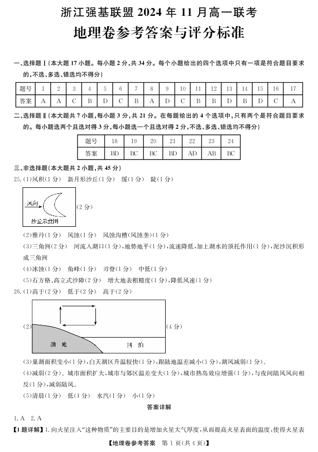浙江省强基联盟2024-2025学年高一上学期11月联考地理答案