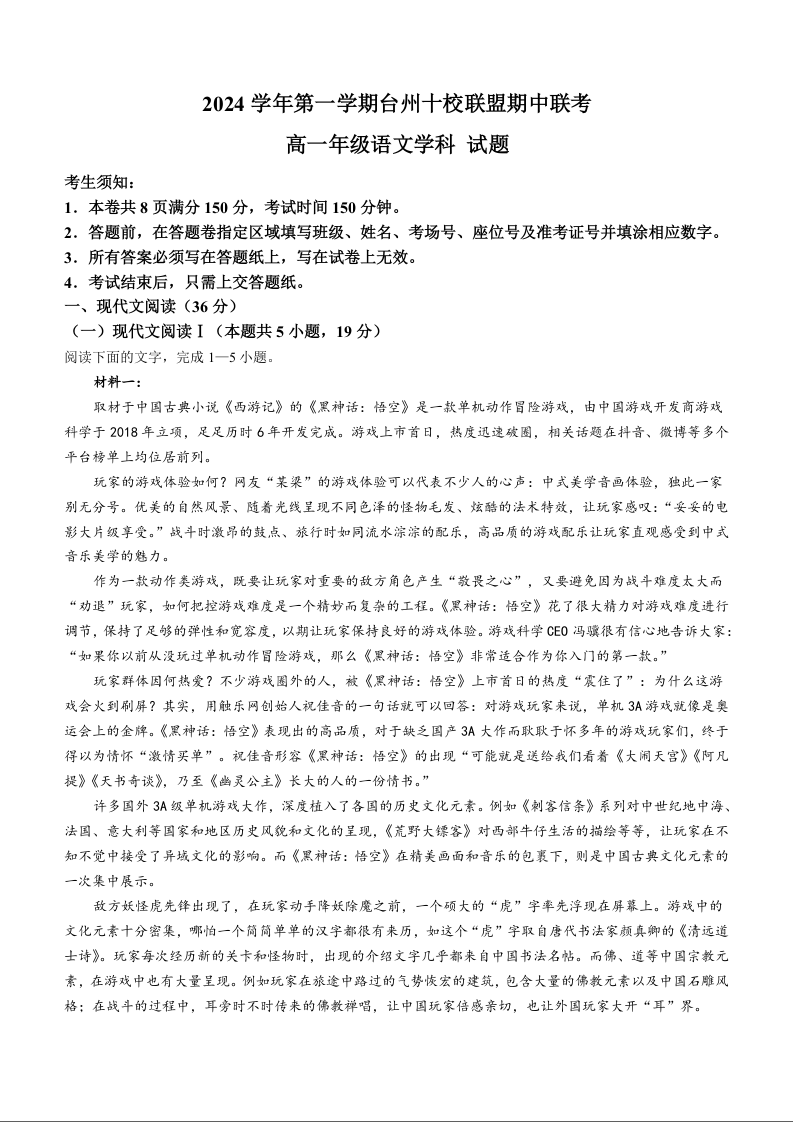 浙江省台州市十校联考2024-2025学年高一上学期11月期中语文+答案