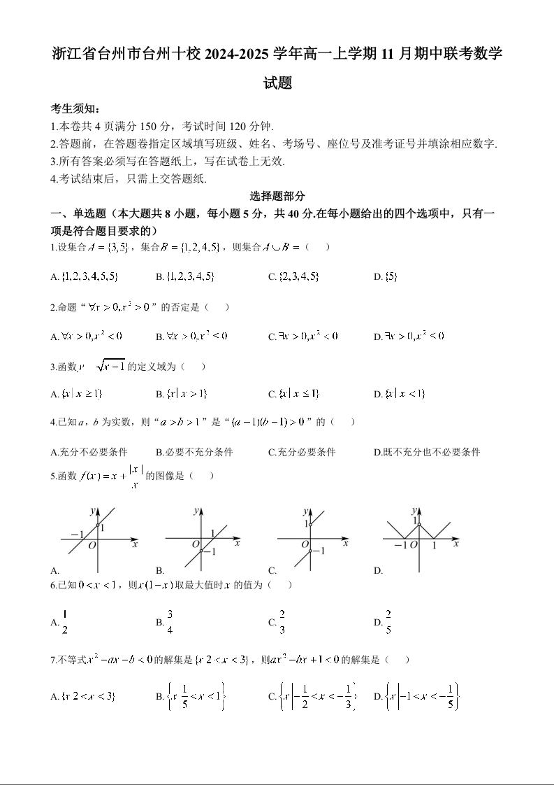 浙江省台州市十校联考2024-2025学年高一上学期11月期中数学+答案