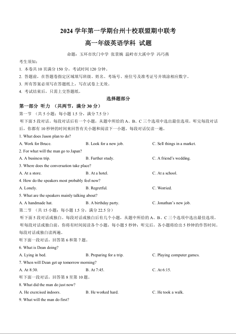 浙江省台州市十校联考2024-2025学年高一上学期11月期中英语+答案