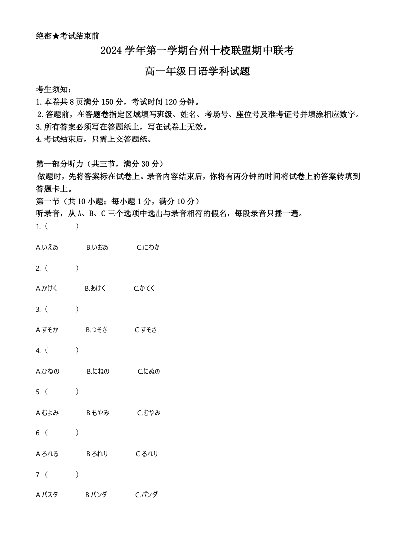 浙江省台州市十校联考2024-2025学年高一上学期11月期中日语+答案