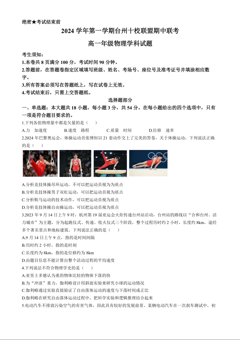 浙江省台州市十校联考2024-2025学年高一上学期11月期中物理+答案