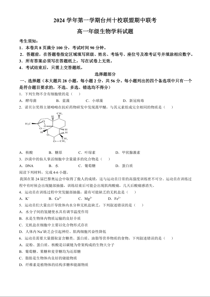 浙江省台州市十校联考2024-2025学年高一上学期11月期中生物+答案