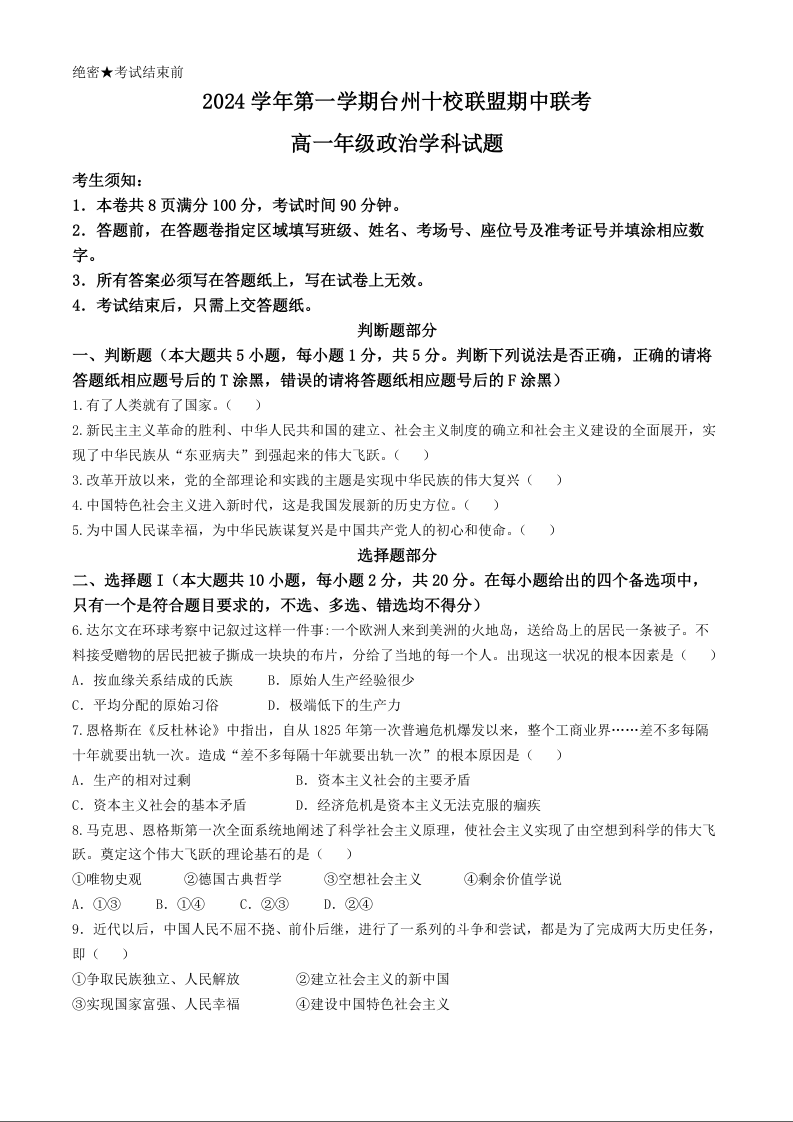 浙江省台州市十校联考2024-2025学年高一上学期11月期中政治+答案