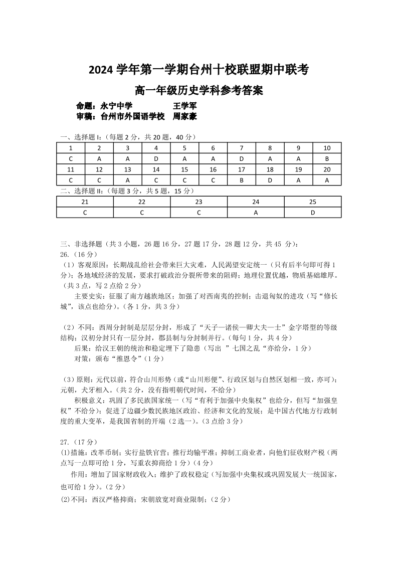 浙江省台州市十校联考2024-2025学年高一上学期11月期中历史答案
