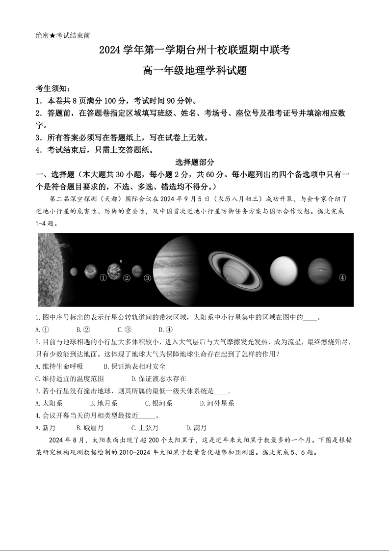 浙江省台州市十校联考2024-2025学年高一上学期11月期中地理+答案